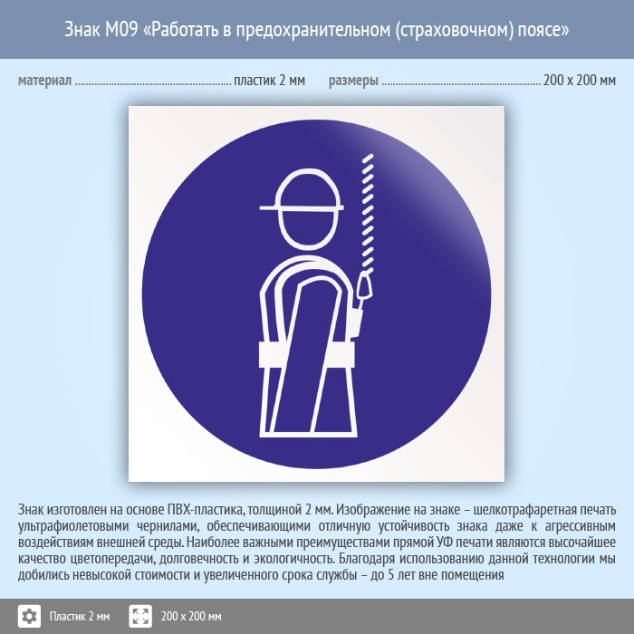 Знак M09 «Работать в предохранительном (страховочном) поясе» (пластик, 200х200 мм) в Бердске купить