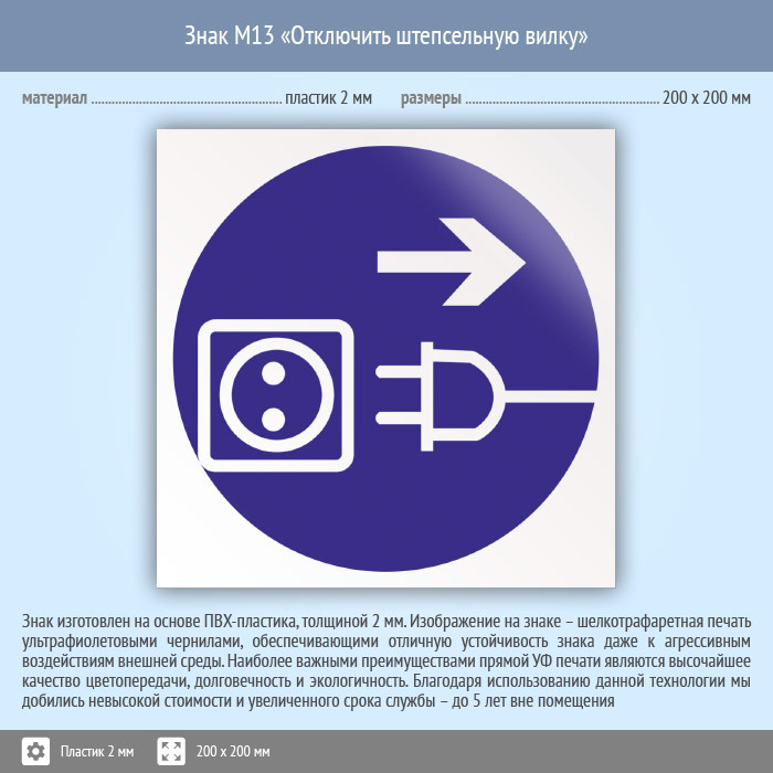 Знак M13 «Отключить штепсельную вилку» (пластик, 200х200 мм) в Бердске купить