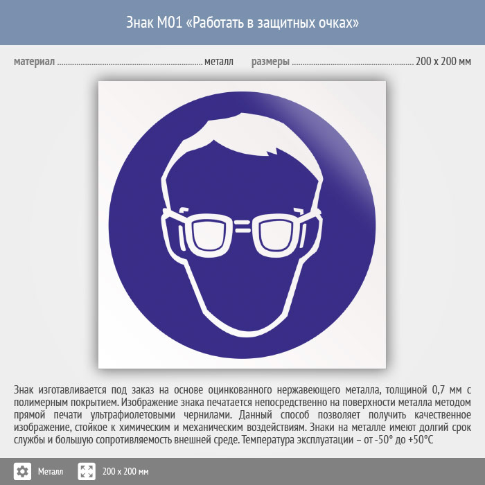 Знак M01 «Работать в защитных очках» (металл, 200х200 мм) в Бердске купить