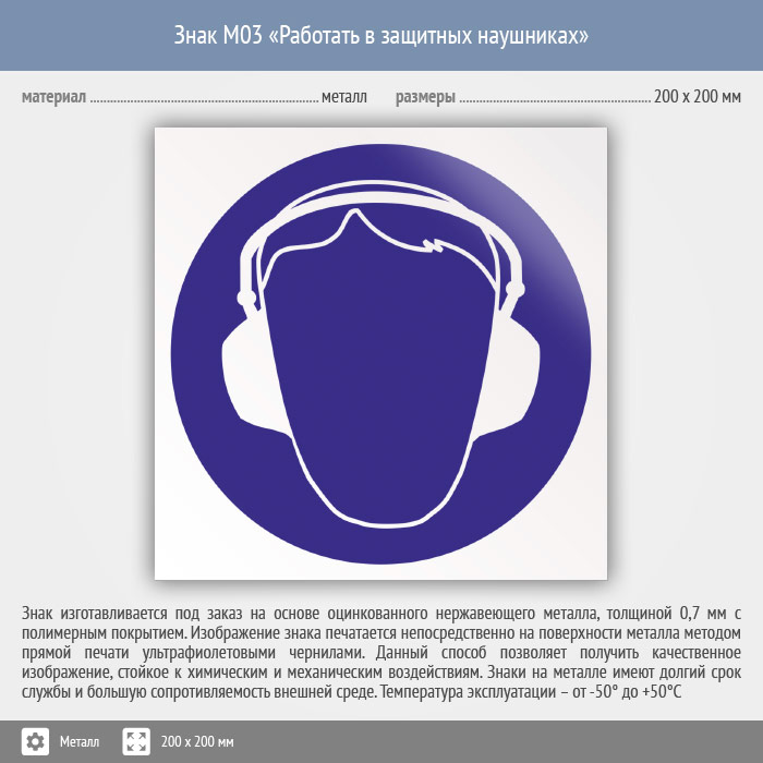 Знак M03 «Работать в защитных наушниках» (металл, 200х200 мм) в Бердске купить