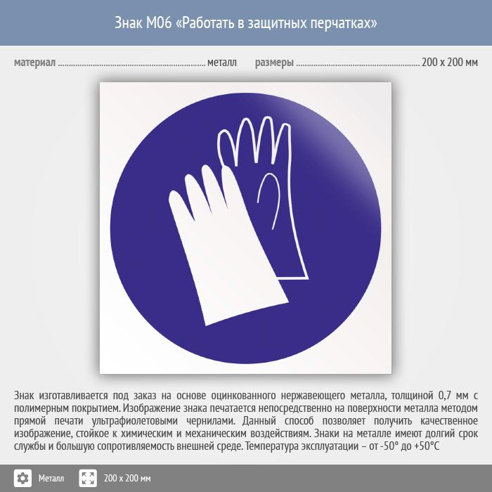 Знак M06 «Работать в защитных перчатках» (металл, 200х200 мм) в Бердске купить