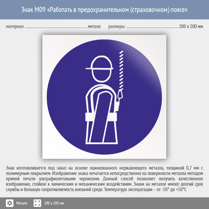 Знак M09 «Работать в предохранительном (страховочном) поясе» (металл, 200х200 мм) в Бердске купить