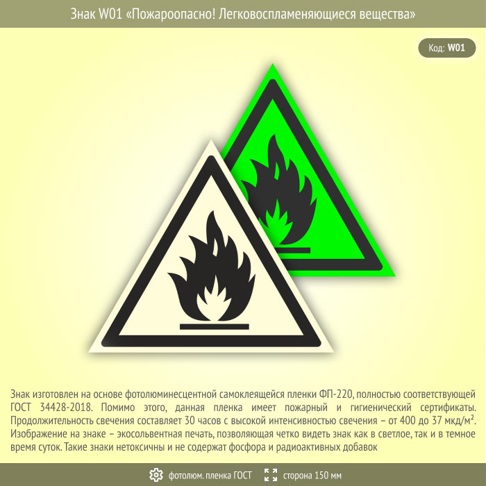 Знак W01 «Пожароопасно! легковоспламеняющиеся вещества» (фотолюминесцентная пленка ГОСТ 34428-2018, сторона 150 мм) в Бердске купить