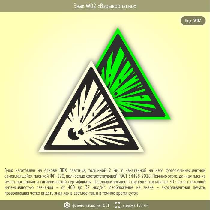Знак W02 «Взрывоопасно» (фотолюминесцентный пластик ГОСТ 34428-2018, сторона 150 мм) в Бердске купить