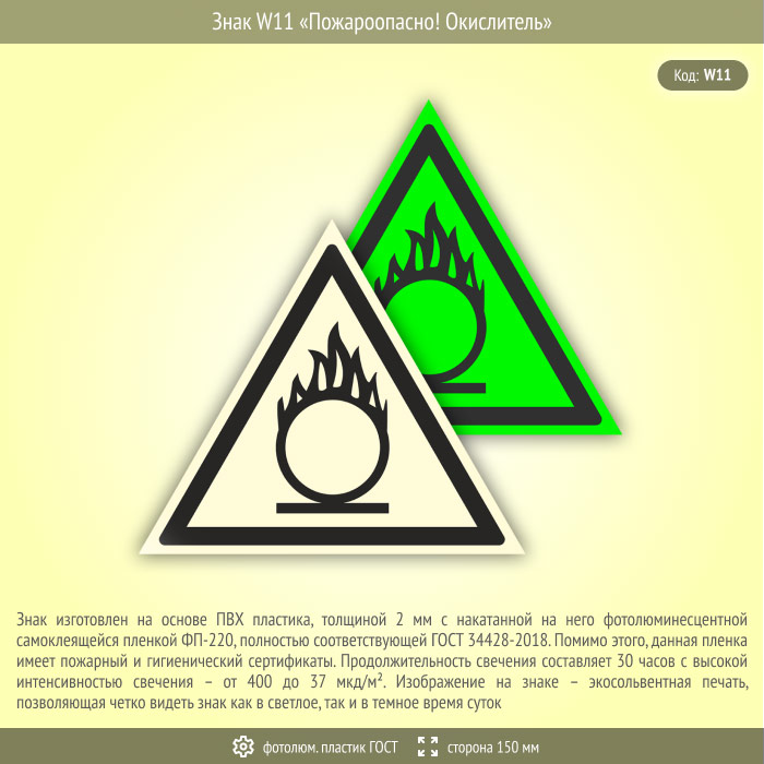 Знак W11 «Пожароопасно! Окислитель» (фотолюминесцентный пластик ГОСТ 34428-2018, сторона 150 мм) в Бердске купить