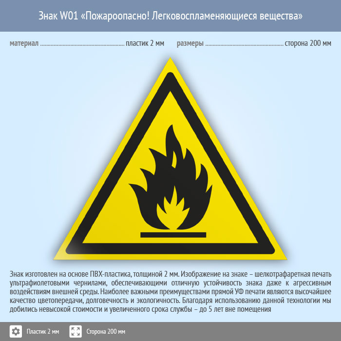Знак W01 «Пожароопасно! легковоспламеняющиеся вещества» (пластик, сторона 200 мм) в Бердске купить