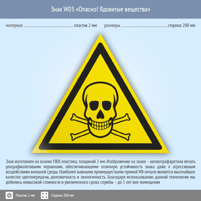 Знак W03 «Опасно! ядовитые вещества» (пластик, сторона 200 мм) в Бердске купить