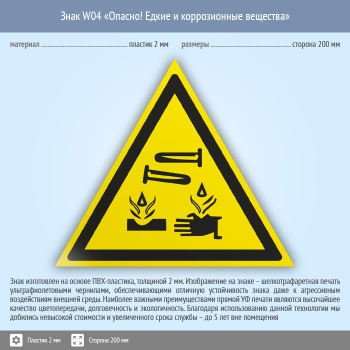 Знак W04 «Опасно! едкие и коррозионные вещества» (пластик, сторона 200 мм) в Бердске купить