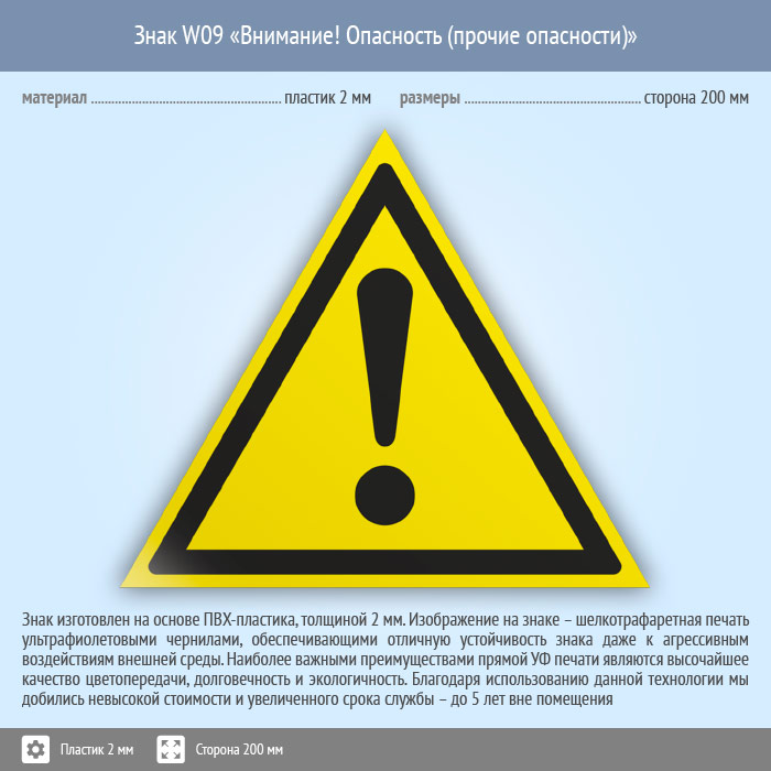 Знак W09 «Внимание! опасность (прочие опасности)» (пластик, сторона 200 мм) в Бердске купить