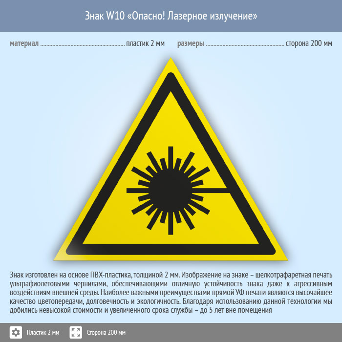 Знак W10 «Опасно! лазерное излучение» (пластик, сторона 200 мм) в Бердске купить