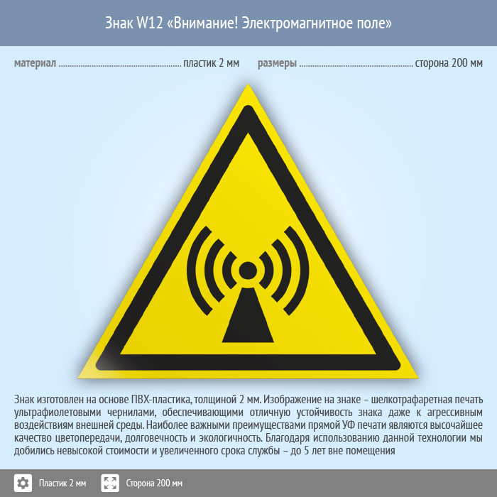 Знак W12 «Внимание! электромагнитное поле» (пластик, сторона 200 мм) в Бердске купить