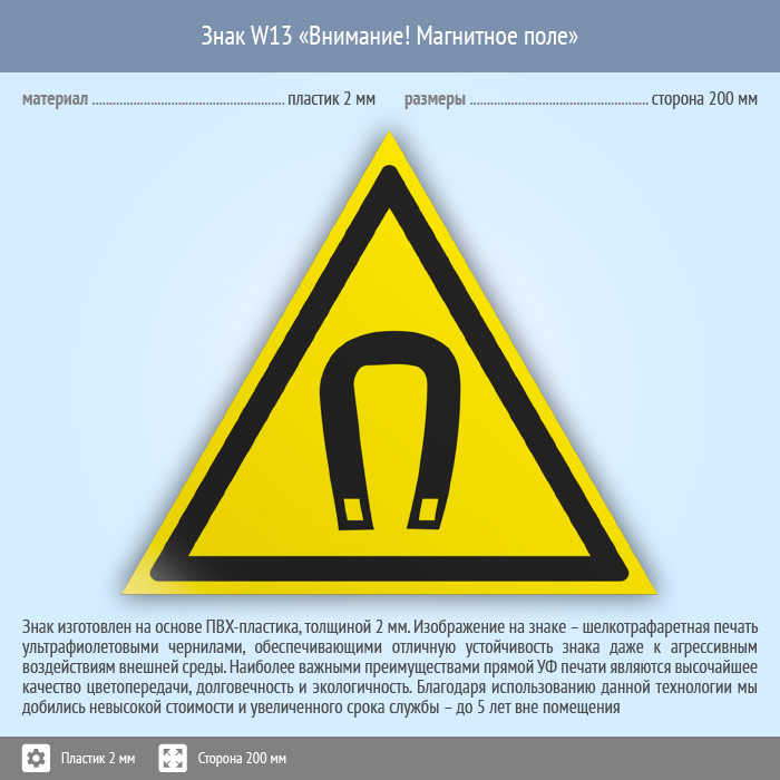 Знак W13 «Внимание! магнитное поле» (пластик, сторона 200 мм) в Бердске купить