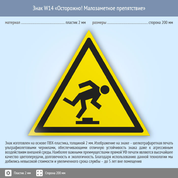Знак W14 «Осторожно! малозаметное препятствие» (пластик, сторона 200 мм) в Бердске купить