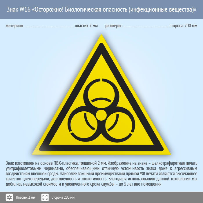 Знак W16 «Осторожно! биологическая опасность (инфекционные вещества)» (пластик, сторона 200 мм) в Бердске купить