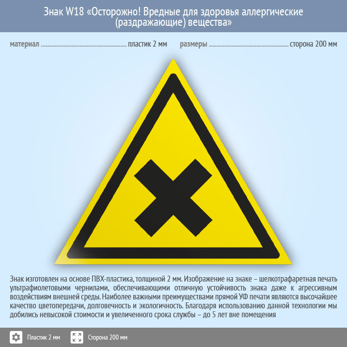 Знак W18 «Осторожно! вредные для здоровья аллергические (раздражающие) вещества» (пластик, сторона 200 мм) в Бердске купить