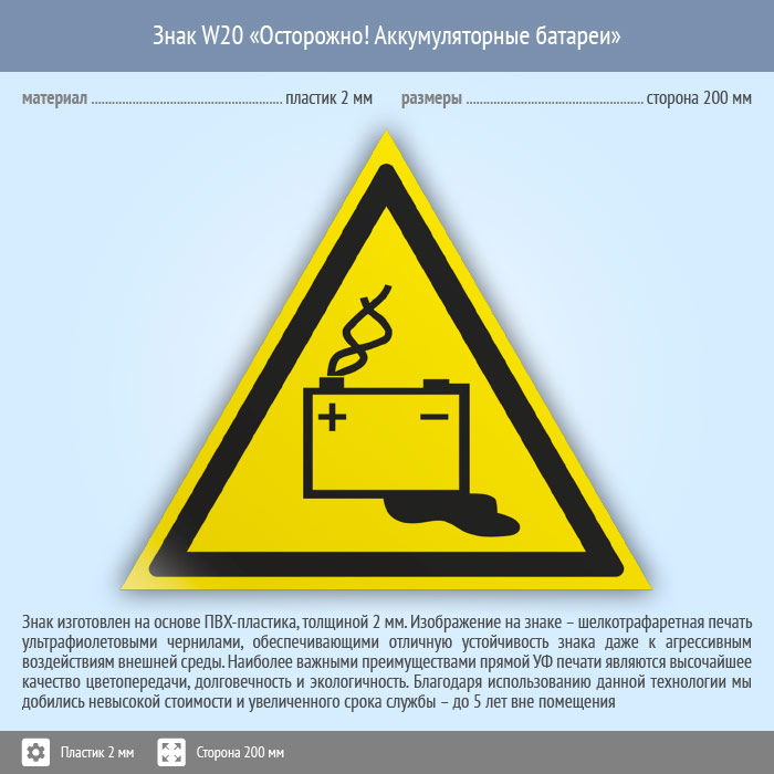 Знак W20 «Осторожно! аккумуляторные батареи» (пластик, сторона 200 мм) в Бердске купить