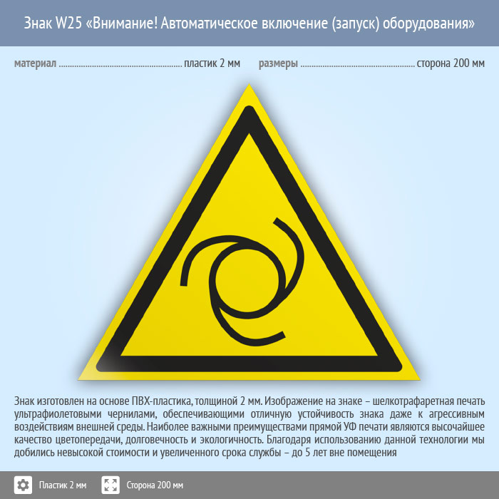 Знак W25 «Внимание! автоматическое включение (запуск) оборудования» (пластик, сторона 200 мм) в Бердске купить