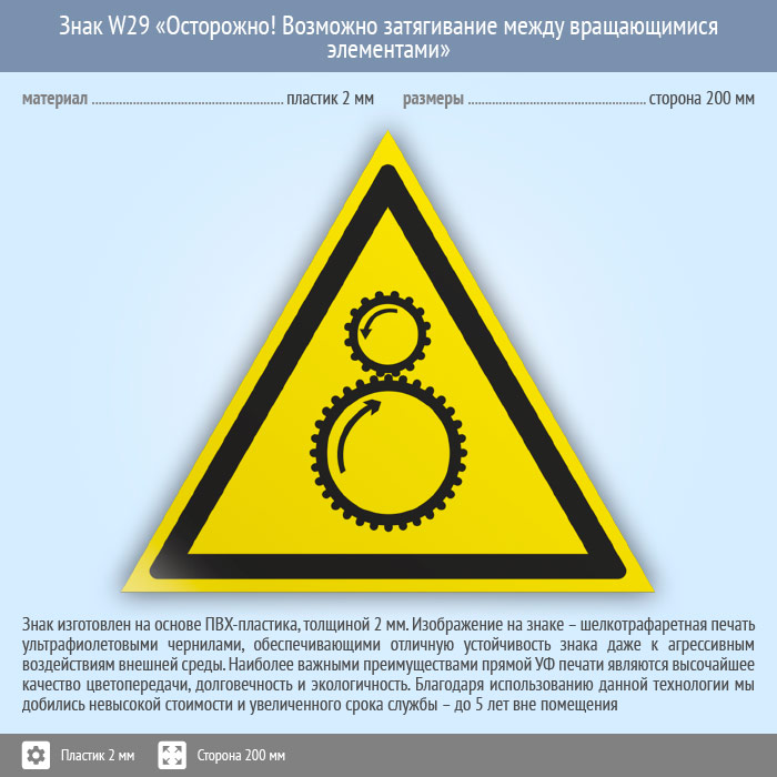 Знак W29 «Осторожно! возможно затягивание между вращающимися элементами» (пластик, сторона 200 мм) в Бердске купить