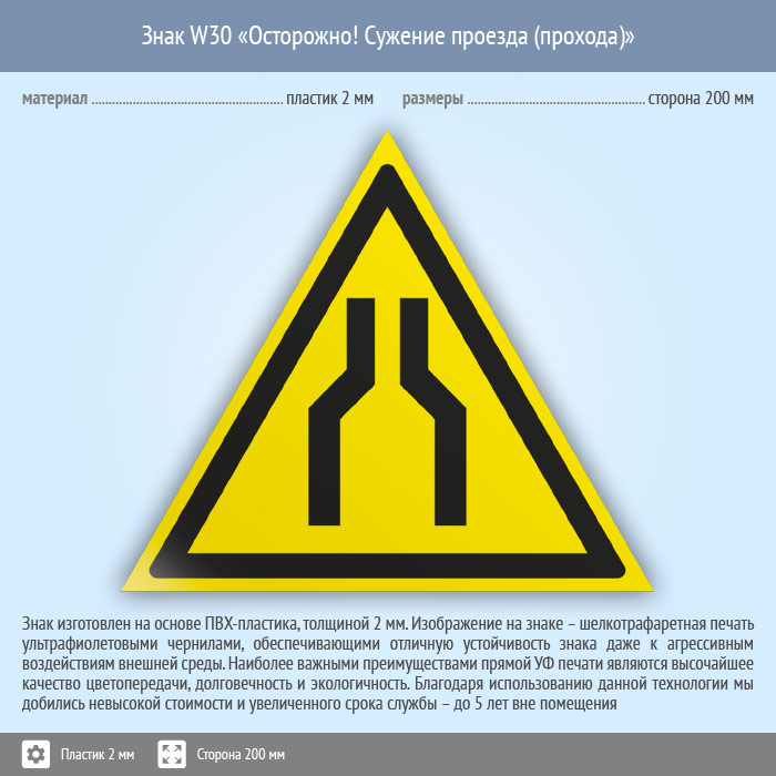 Знак W30 «Осторожно! сужение проезда (прохода)» (пластик, сторона 200 мм) в Бердске купить