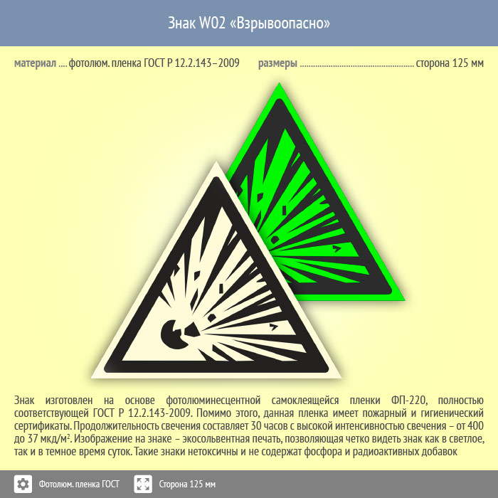 Знак W02 «Взрывоопасно» (фотолюминесцентная пленка ГОСТ 34428-2018, сторона 125 мм) в Бердске купить