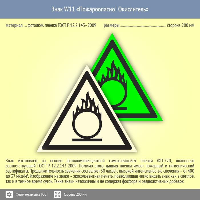 Знак W11 «Пожароопасно! окислитель» (фотолюминесцентная пленка ГОСТ 34428-2018, сторона 200 мм) в Бердске купить
