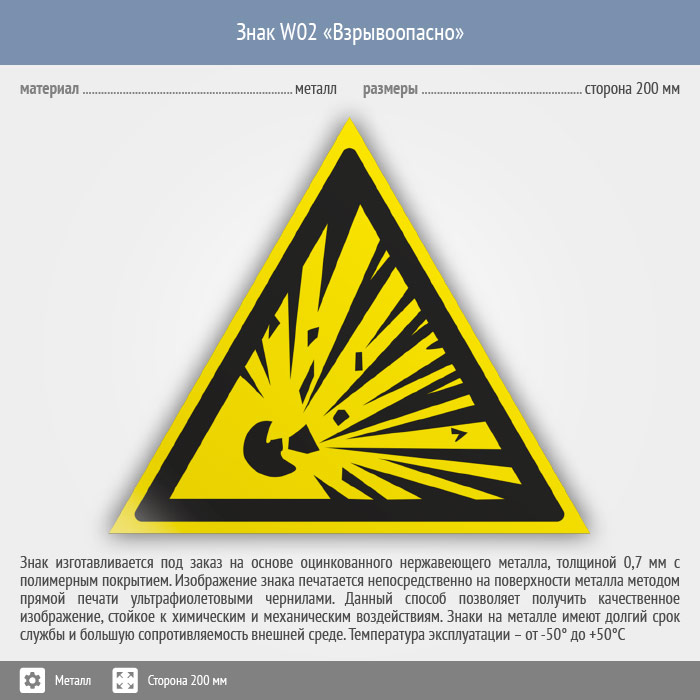 Знак W02 «Взрывоопасно» (металл, сторона 200 мм) в Бердске купить