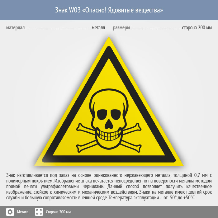 Знак W03 «Опасно! ядовитые вещества» (металл, сторона 200 мм) в Бердске купить