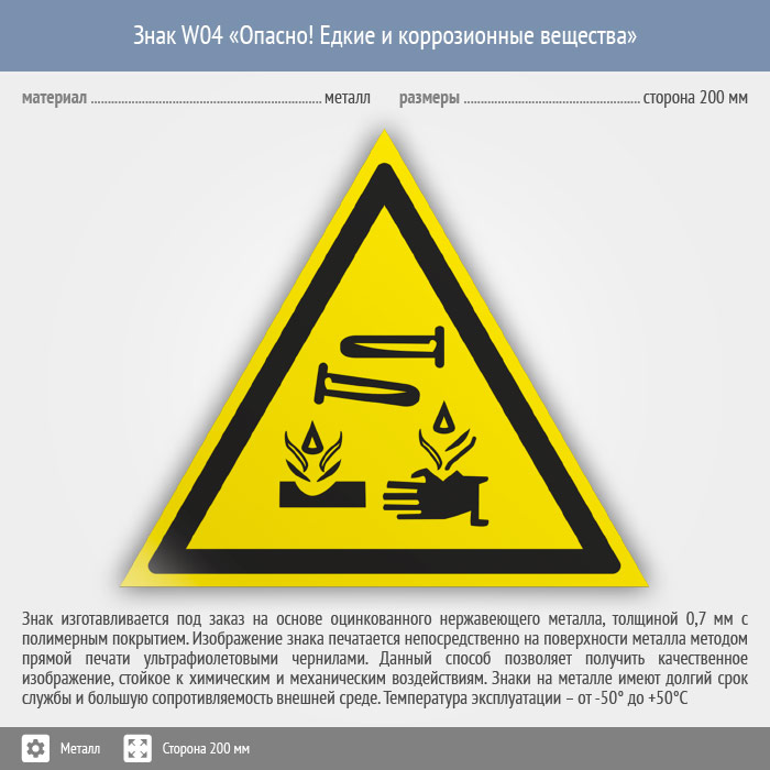 Знак W04 «Опасно! едкие и коррозионные вещества» (металл, сторона 200 мм) в Бердске купить