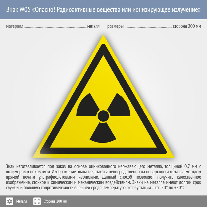 Знак W05 «Опасно! радиоактивные вещества или ионизирующее излучение» (металл, сторона 200 мм) в Бердске купить