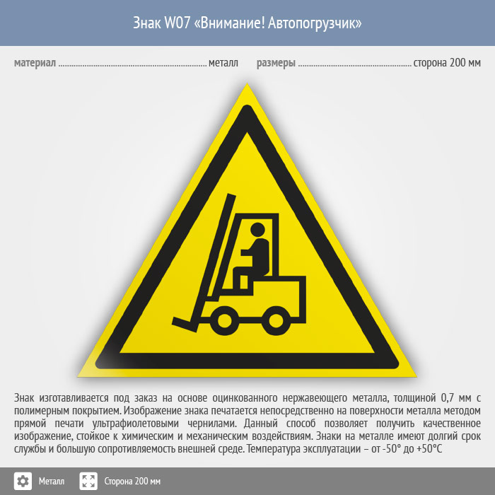 Знак W07 «Внимание! автопогрузчик» (металл, сторона 200 мм) в Бердске купить