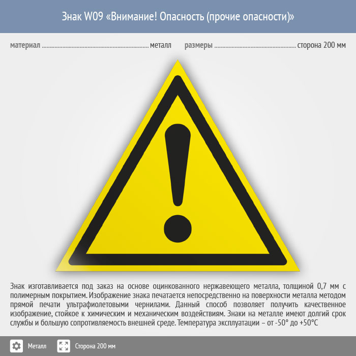 Знак W09 «Внимание! опасность (прочие опасности)» (металл, сторона 200 мм) в Бердске купить