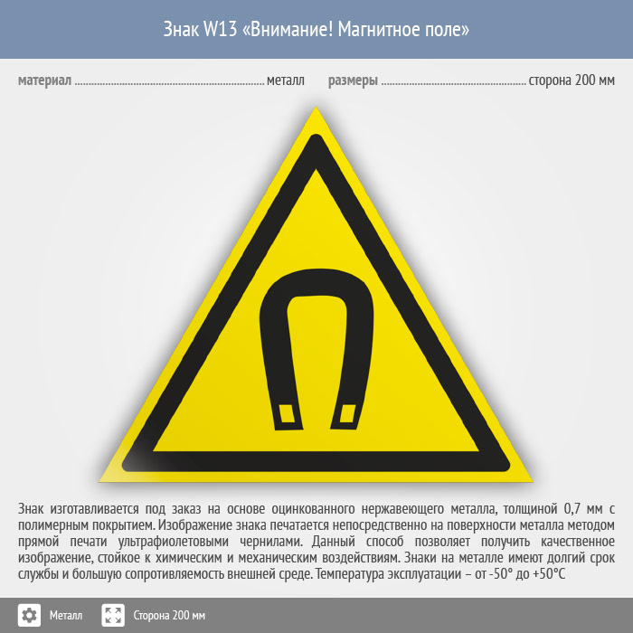 Знак W13 «Внимание! магнитное поле» (металл, сторона 200 мм) в Бердске купить