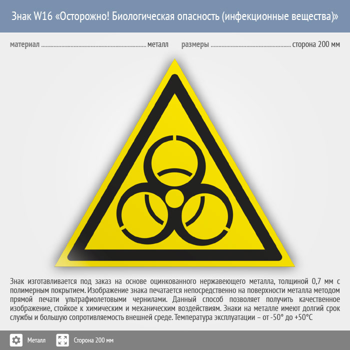 Знак W16 «Осторожно! биологическая опасность (инфекционные вещества)» (металл, сторона 200 мм) в Бердске купить
