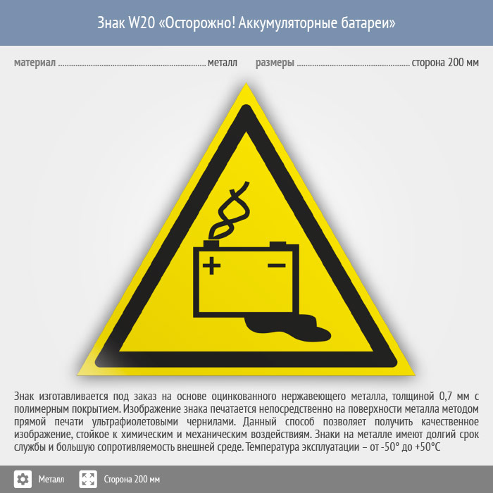 Знак W20 «Осторожно! аккумуляторные батареи» (металл, сторона 200 мм) в Бердске купить