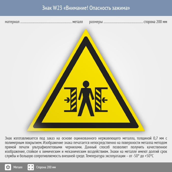Знак W23 «Внимание! опасность зажима» (металл, сторона 200 мм) в Бердске купить