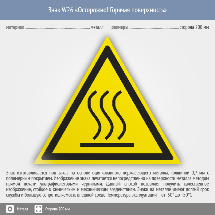 Знак W26 «Осторожно! горячая поверхность» (металл, сторона 200 мм) в Бердске купить
