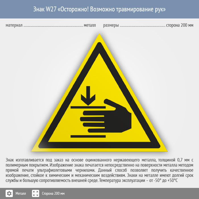 Знак W27 «Осторожно! возможно травмирование рук» (металл, сторона 200 мм) в Бердске купить