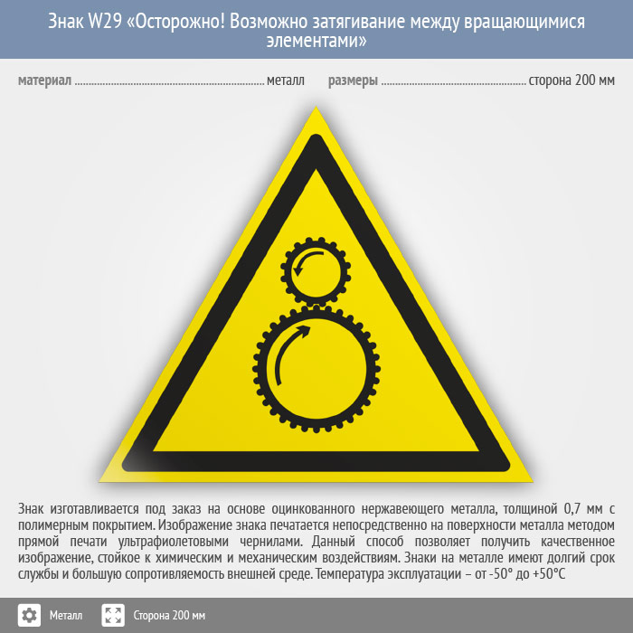 Знак W29 «Осторожно! возможно затягивание между вращающимися элементами» (металл, сторона 200 мм) в Бердске купить