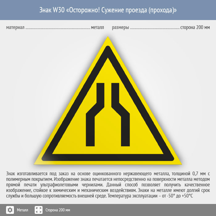 Знак W30 «Осторожно! сужение проезда (прохода)» (металл, сторона 200 мм) в Бердске купить