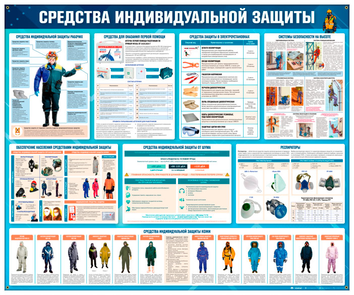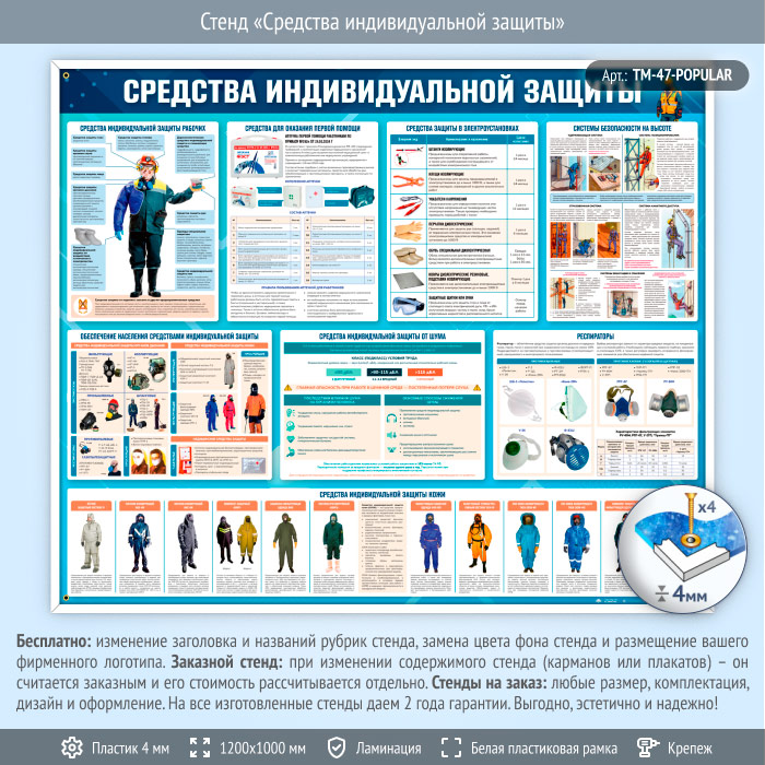 Стенд «Средства индивидуальной защиты» (TM-47) содержит наглядную и структурированную информацию о видах, назначении и правилах применения средств индивидуальной защиты (СИЗ) при работе в опасных и вредных производственных условиях. Представлены основные элементы защитной экипировки рабочих, средства защиты при работе на высоте, в электроустановках, в условиях шума, пыли и химического воздействия. Отдельные блоки посвящены респираторам, средствам защиты кожи, комплектации аптечек и обеспечению населения средствами СИЗ. Стенд помогает повысить осведомлённость работников о необходимых мерах безопасности и способствует правильному выбору и применению защитных средств.