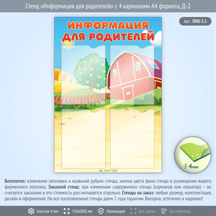 Стенд «Информация для родителей» с 4 карманами А4 формата (DOU-2.1) в Бердске купить