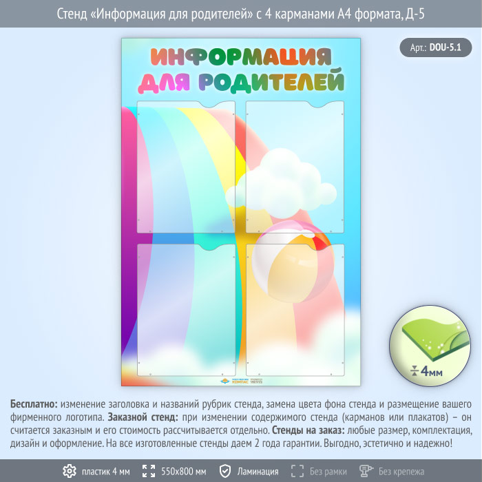 Стенд «Информация для родителей» с 4 карманами А4 формата (DOU-5.1) в Бердске купить