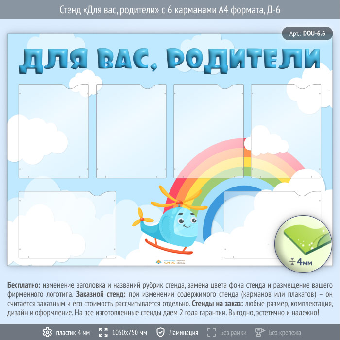 Стенд «Для вас, родители» с 6 карманами А4 формата (DOU-6.6) в Бердске купить