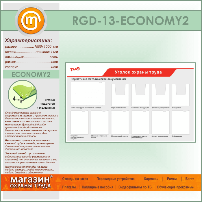 Стенд «Уголок охраны труда» с 1 плоским карманом А3 формата, 6 плоскими и 4 объемными карманами А4 формата (RGD-13-ECONOMY2) в Бердске купить