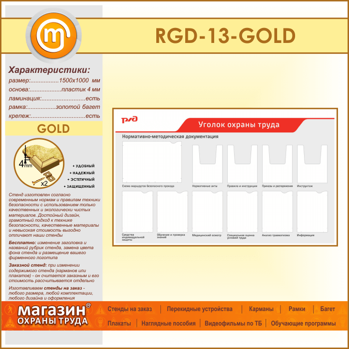 Стенд «Уголок охраны труда» с 1 плоским карманом А3 формата, 6 плоскими и 4 объемными карманами А4 формата (RGD-13-GOLD) в Бердске купить