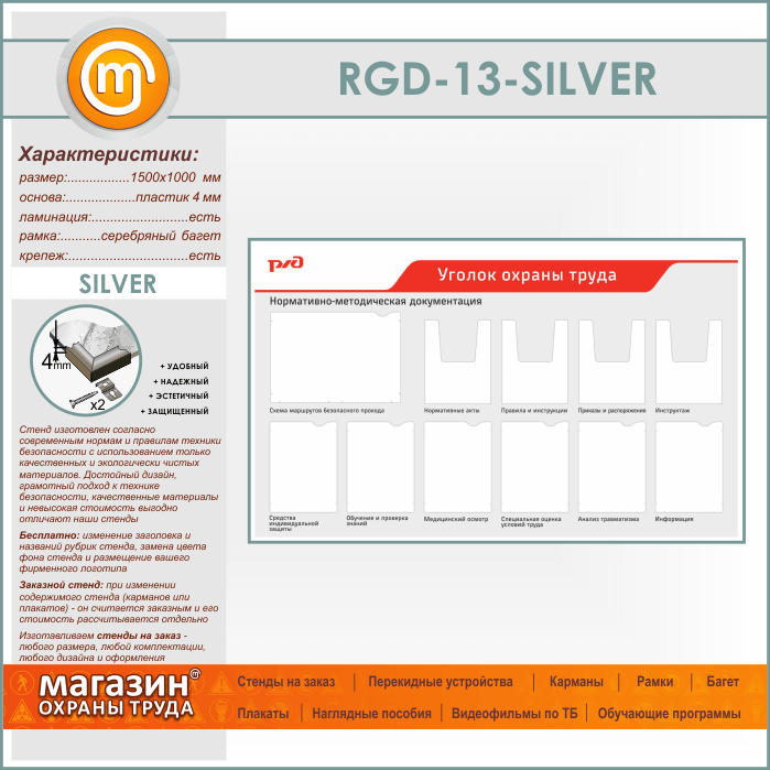 Стенд «Уголок охраны труда» с 1 плоским карманом А3 формата, 6 плоскими и 4 объемными карманами А4 формата (RGD-13-SILVER) в Бердске купить