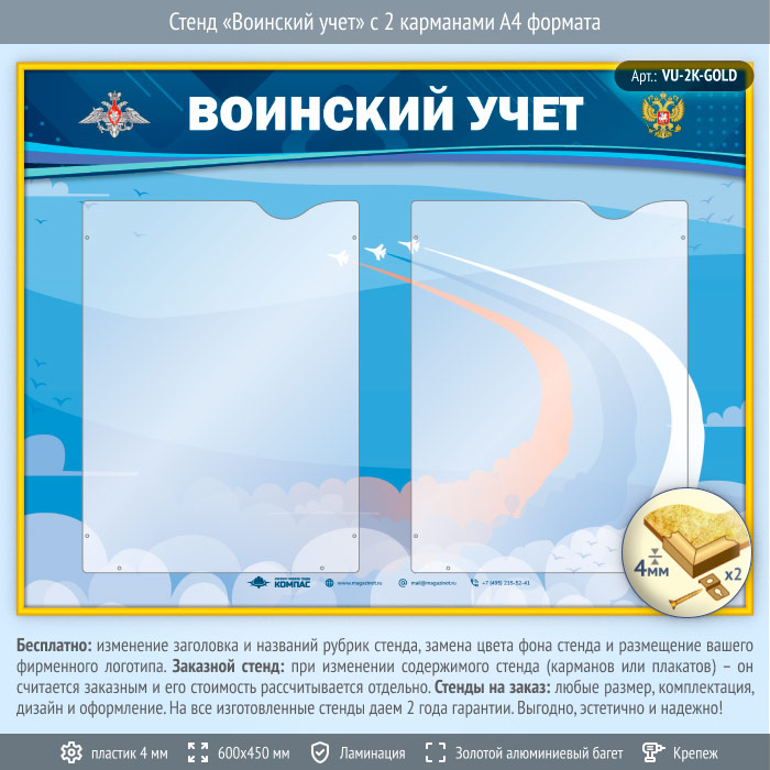 Стенд «Воинский учет» с 2 карманами А4 формата (VU-2K-GOLD) в Бердске купить