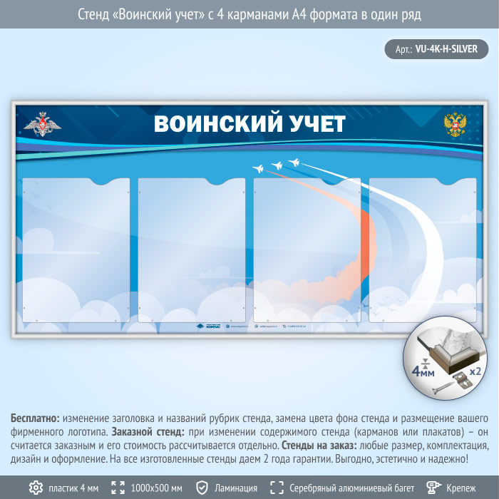Стенд «Воинский учет» с 4 карманами А4 формата в один ряд (VU-4K-H-SILVER) в Бердске купить