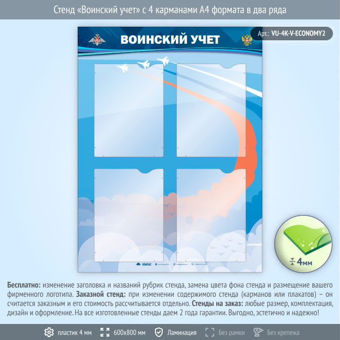 Стенд «Воинский учет» с 4 карманами А4 формата в два ряда (VU-4K-V-ECONOMY2) в Бердске купить
