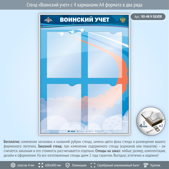 Стенд «Воинский учет» с 4 карманами А4 формата в два ряда (VU-4K-V-SILVER) в Бердске купить